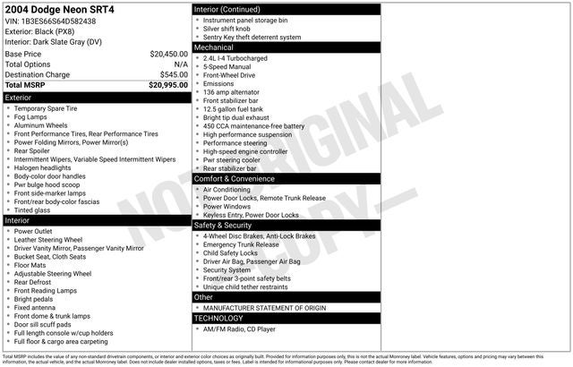 Discover the thrill of driving with this exceptional 2004 Dodge SRT-4 Base. Boasting a powerful 2.4L I4 DOHC 16V HO Turbocharged engine and a smooth 5-Speed Manual transmission, this vehicle delivers an exhilarating performance that's sure to captivate your senses.