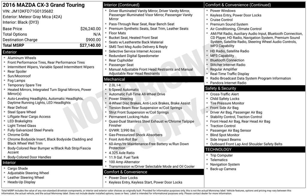 Boasting a striking Gray exterior, the CX-3 Grand Touring is more than just a pretty face. Under the hood, you'll find the SKYACTIV®-G 2.0L 4-Cylinder DOHC 16V engine, delivering a thrilling and efficient performance with its 6-Speed Automatic transmission and all-wheel-drive capabilities. With an impressive 27 city/32 highway MPG, you can enjoy the open road without constantly stopping at the pump.