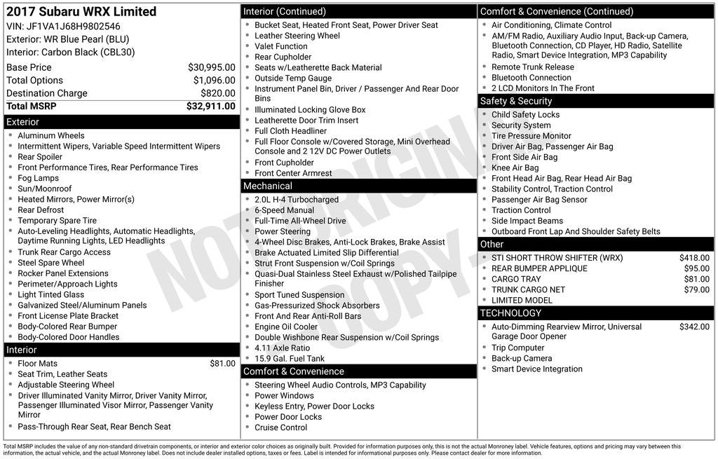 Beneath the hood, this WRX Limited is powered by a robust 2.0L DOHC Intercooled Turbocharged engine, paired with a smooth-shifting 6-Speed Manual transmission and Subaru's renowned All-Wheel Drive system. Experience the perfect blend of performance and control, with an impressive 20 city/27 highway MPG rating.