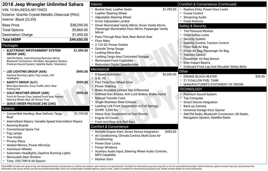 Powered by a robust 3.6L V6 24V VVT engine and equipped with 4-Wheel Drive, this Wrangler delivers an exceptional driving experience both on and off the road. With an EPA-estimated 18 MPG in the city and 23 MPG on the highway, you'll enjoy the perfect balance of capability and efficiency.