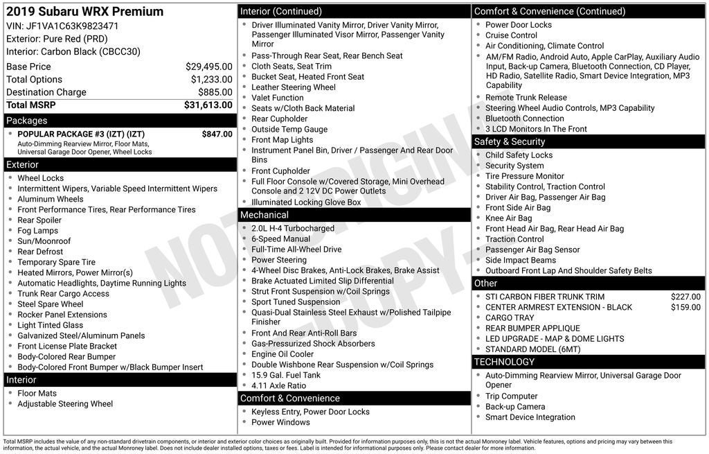 Elevate your commute and conquer the open road in style with the 2019 Subaru WRX Premium. Outfitted with a host of premium features, this sports car is designed to captivate and inspire. From the striking Red exterior to the performance-oriented interior, every detail has been meticulously crafted to deliver an unparalleled driving experience.