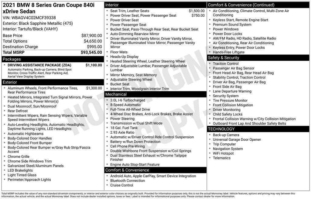 Elevate your driving experience with this stunning 2021 BMW 8 Series 840. Boasting a sleek black exterior and a powerful 3.0L I6 DOHC 24V TwinPower Turbo engine, this all-wheel-drive coupe delivers an unparalleled blend of performance and style.