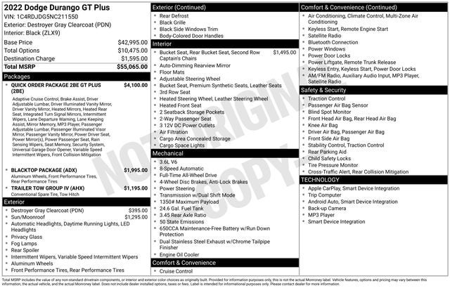This remarkable 2022 Dodge Durango GT Plus is a true standout in the world of full-size SUVs. With its sleek Destroyer Gray Clearcoat exterior, powerful 3.6L V6 engine, and advanced all-wheel-drive capabilities, this Durango is ready to take on any adventure you have in mind.
