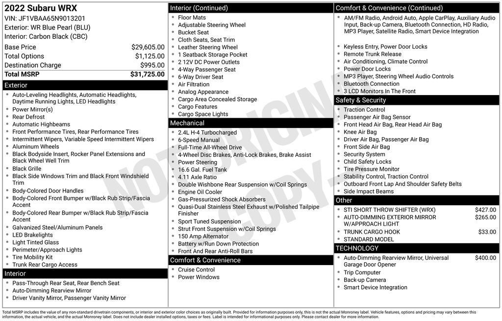 - Vehicle Name: Subaru WRX