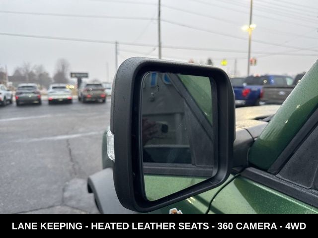 **2.7L V6 ENGINE**SASQUATCH PACKAGE**12 TOUCHSCREEN WITH NAVIGATION**HEATED SEATS AND STEERING WHEEL**SOFT TOP**WIRELESS CHARGING PAD**360 DEGREE CAMERA**PRE-COLLISION ASSIST**FORD PASS CONNECT**FOUR WHEEL DRIVE**FULLY INSPECTED AND SERVICED**Eruption Green Metallic 2023 Ford Bronco Wildtrak 2.7L V6 SASQUATCH 4WD 10-Speed Automatic 2.7L EcoBoost V6 *NAVIGATION, *FULLY SERVICED, *REMOTE START, *REARVIEW CAMERA, *LEATHER HEATED SEATS, 10 Speakers w/Subwoofer, 12 LCD Capacitive Touchscreen w/Swipe Capability, 2 Smart Charging USB Ports In Dashboard, 360-Degree Camera, 4.7 Final Drive Ratio, ABS brakes, Adaptive Cruise Control, Additional Sound Deadening, Compass, Connected Built-In Navigation, Electronic Stability Control, Equipment Group 354A Lux Package, Evasive Steering Assist, Front Parking Sensors, Heated door mirrors, Heated Steering Wheel, High Clearance Fender Flares, High Clearance Suspension, Illuminated entry, Information on Demand Panel, Low tire pressure warning, Navigation System, Position-Sensitive Bilstein Shock Absorbers, Radio: B&O Sound System by Bang & Olufsen, Remote keyless entry, Sasquatch Package, Sideview Mirrors, Traction control, Universal Garage Door Opener, Wheels: 17 Black High Gloss-Painted Aluminum, Wireless Charging Pad.