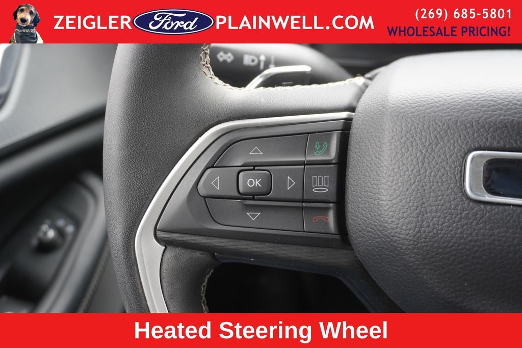 This Grand Cherokee L Altitude exudes a bold, confident presence with its striking Black exterior and sleek Gloss Black accents. Step inside and you'll be surrounded by premium materials and thoughtful design, from the heated leather-wrapped steering wheel to the wireless charging pad and 3rd-row USB ports.