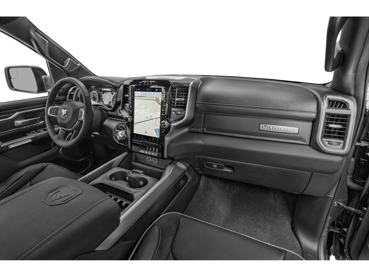 The interior of the Laramie is a true sanctuary, with luxurious leather-trimmed bucket seats, a heated steering wheel, and a panoramic sunroof that floods the cabin with natural light. The 12-inch touchscreen display puts advanced connectivity and navigation at your fingertips, while the premium harman/kardon audio system delivers an immersive listening experience.